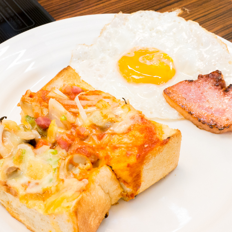 ピザトーストはトマトソースの甘酸っぱさと玉ねぎの辛さのバランスが程よく、ちょっと厚みのある柔らかめのトーストで食べやすい一品。