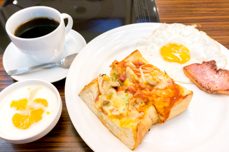メニューはパン(ピザトースト or たまごサンド)、フルーツヨーグルト、ベーコンエッグとなっていて、ドリンクはコーヒー・紅茶・オレンジジュースの3種類から選べます。