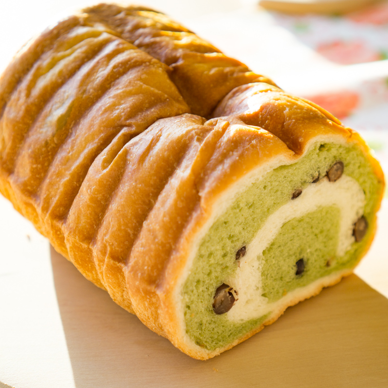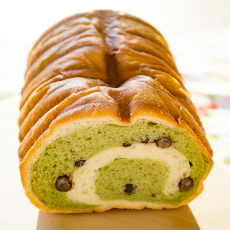 断面図。抹茶生地とプレーン生地がまるっとなっていてカワイイですね!