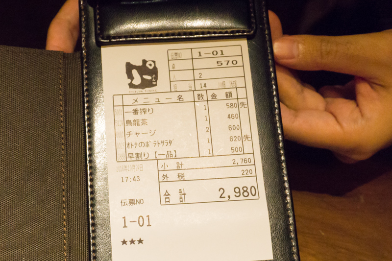 ・テーブルチャージ300円×2=600円(税別)