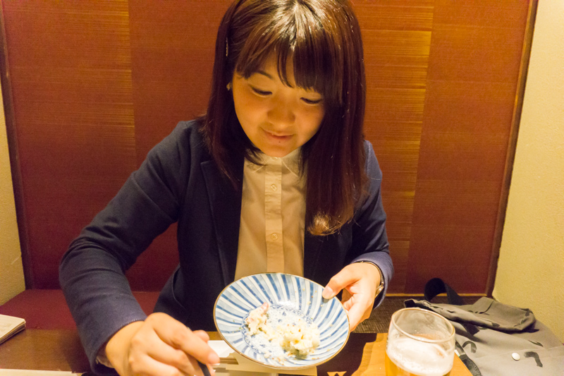 おさや:あっつあつ!めっちゃビールに合う!!脂がのってて、ジューシーですね。甘辛でごまが合う〜。これはヤバい!!おいしいぞ!!