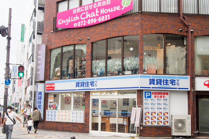 枚方市駅すぐそばの三和ビル2Fにあります。写真でいうと、このまま横断歩道を渡ります。