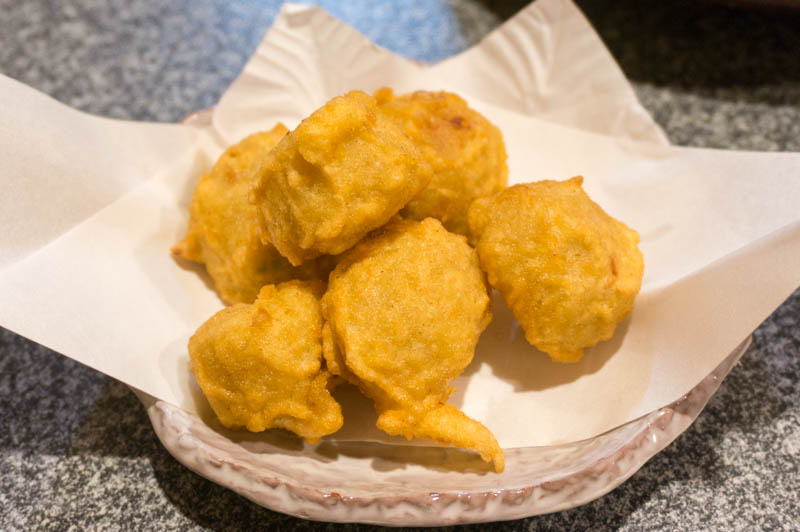 「普通の天ぷらとはちょっと衣が違いますね。ちょっとさつま揚げっぽい感じの衣というか。しかも味が付いてますよ。」