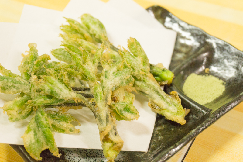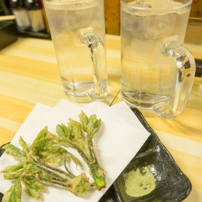 鮮やかな緑がキレイなサクサクの山菜。苦みがクセになる感じ。大人の味!