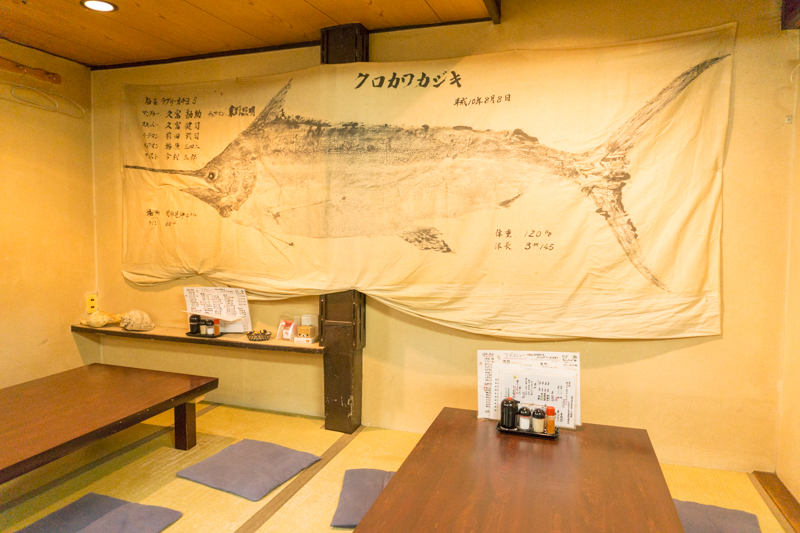 ↓ちなみに座敷席に飾ってある巨大な魚拓は店主さんが昔海で釣った魚だそう!