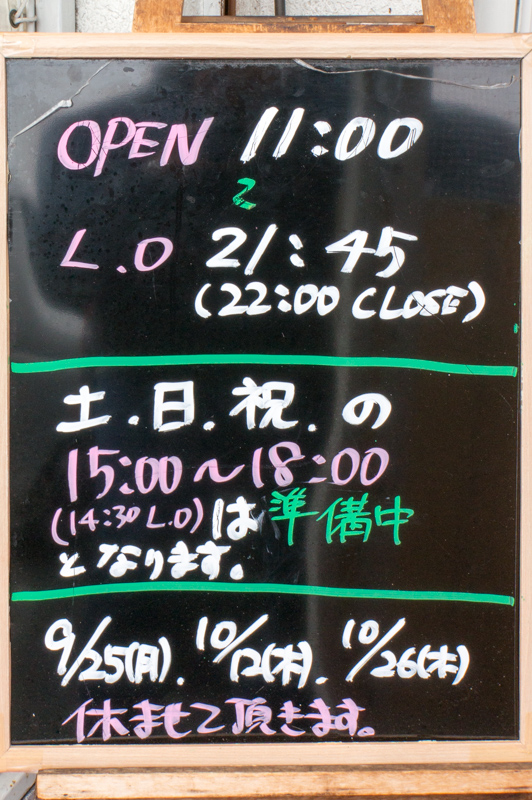 11:00-22:00(L.O.21:45)※土日祝の15:00-18:00(L.O.14:30)は準備中になります。