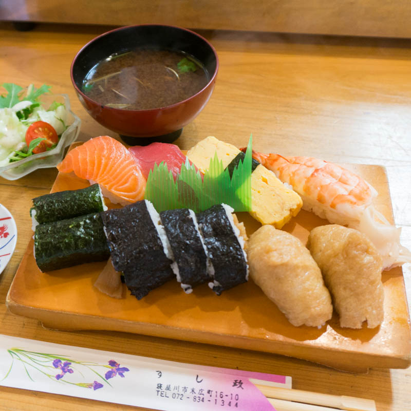にぎり寿司4貫、巻寿司3貫、細巻き2個、いなり寿司2個に加え、サラダと汁物が付いてきます。