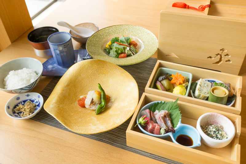 そのあともサラダ、お造り盛り合わせ(この日は中トロ・鯛の焼霜・しまあじ)、季節の焚き合わせ(松笠くわい・さつまいも・小茄子・人参・焼き湯葉・かぼちゃ)、本日の小鉢(ほうれん草白あえ)、焼き物(カレイ)、小袖出し巻き玉子、季節の温物(マナガツオの柚庵焼き、焼きリンゴ・うに・伏見唐辛子・トマトを添えて)、ご飯、味噌汁、自家製デザート、珈琲(マホロバ珈琲堂配合、紅茶も選べます)と、品数もボリュームもたっぷり。