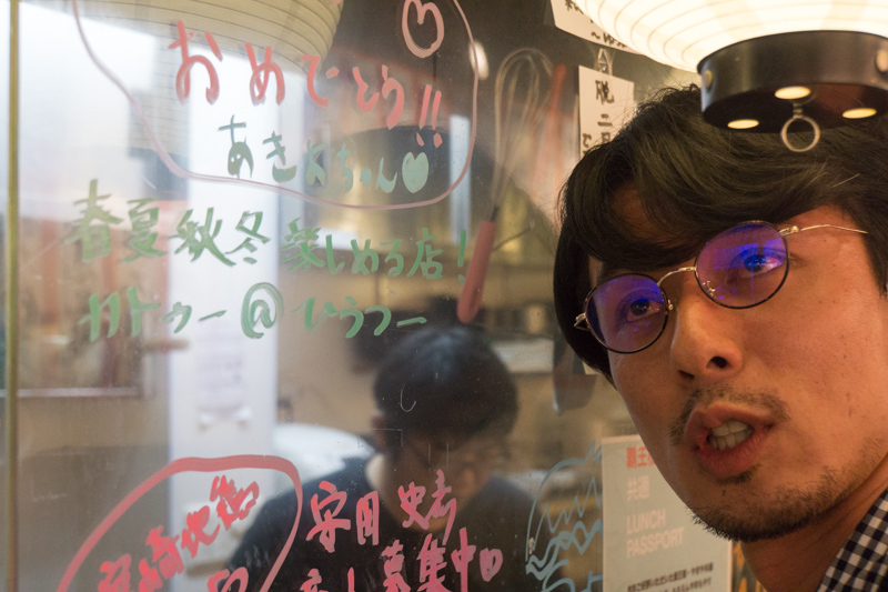 お店のガラス面には自由に字が書けるスペースがあり、そこにカトゥーが書いたのはやはりポエム的表現でした(笑)