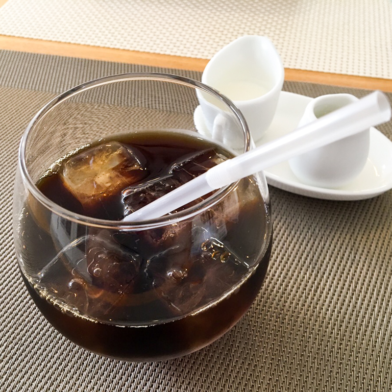 丸くてコロコロするかわいらしいコップに入った冷たいアイスコーヒー。食後にゆっくりくつろげます