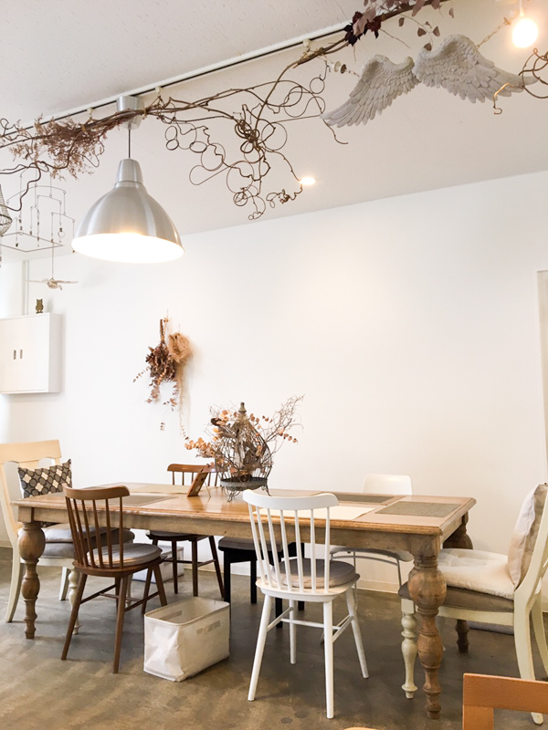天井にもモビールなどのかわいいインテリアが。テーブル席とカウンター席の両方があるので、友達とランチやお茶してもいいですし、一人でも気軽に立ち寄れるカフェです。
