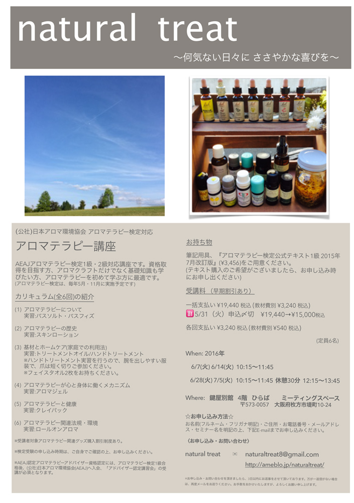 【持ち物】筆記用具、『アロマテラピー検定公式テキスト1級 2015年7月改訂版』(¥3,456)をご用意ください。(テキスト購入のご希望がございましたら、お申し込み時にお申し出ください)【定員】6名(予約制)