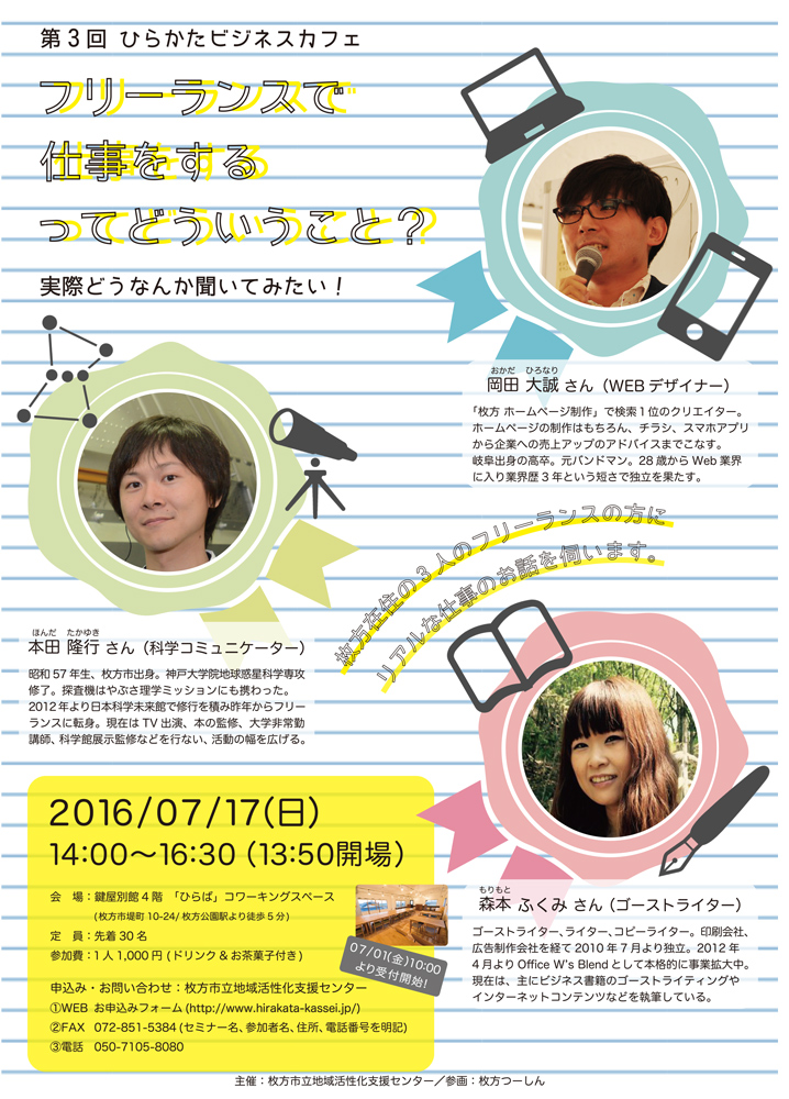 今回は主に枚方市近隣でフリーランスで仕事をされている3人の方にお話ししていただきます。