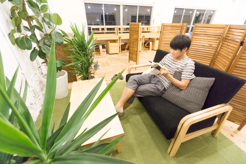 コワーキングスペースを背にしてソファーに座るので、人の目が気になりません。