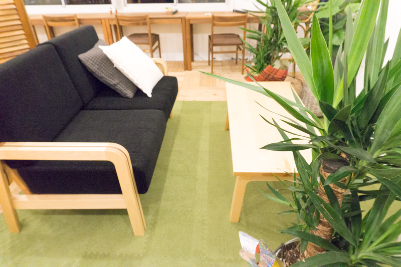 淀川河川敷の芝生をイメージした床に、ふかふかのソファーとクッション。そして青々と繁る植物。