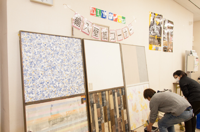 90×90の壁板にコツや順番を教えていきながら、実際にお客様に貼っていただきます。