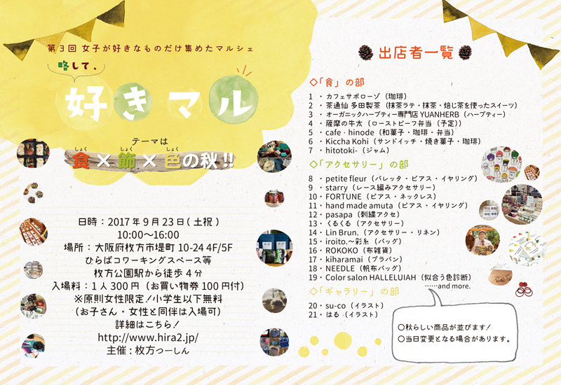 SHOKUの秋到来!女子限定『第3回女子が好きなものだけ集めたマルシェ〜好きマル〜』9/23(土)開催!スタンプラリーも【ひらば】