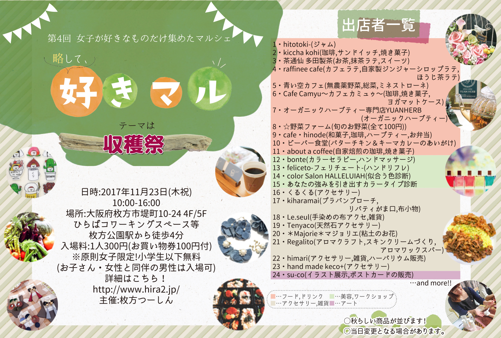 11/23(木)女子限定『第4回女子が好きなものだけ集めたマルシェ』テーマは「収穫祭」!スタンプラリーで抹茶ケーキも【ひらば】