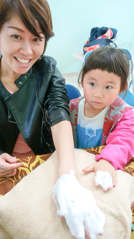 手にふわふわの泡パックをしたあとに、天然保湿成分アロエベラ配合のクリームを使用してハンドリフレをします。