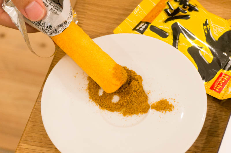各々好きなうまい棒を手に取り、まずはカレー粉をつけてみます。カレー味になるかと思われましたが…