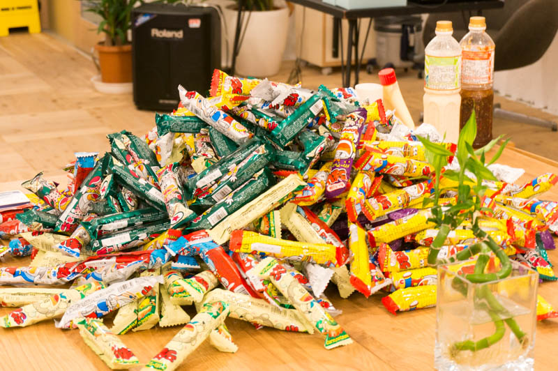 すどん@ひらつー主催「第2回 うまい棒のよりうまい食べ方を模索する会」の様子。@ひらば4階コワーキングスペース