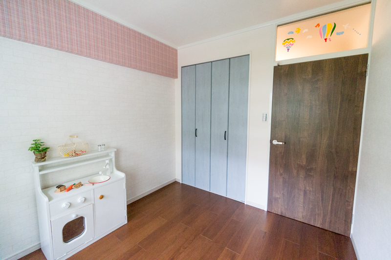 壁紙もポイントで柄物を入れ、楽しい感じに仕上げています。わざとクローゼットだけブルーグレイにし、床とドアもシックな感じにして飽きのこないお部屋を意識しました。