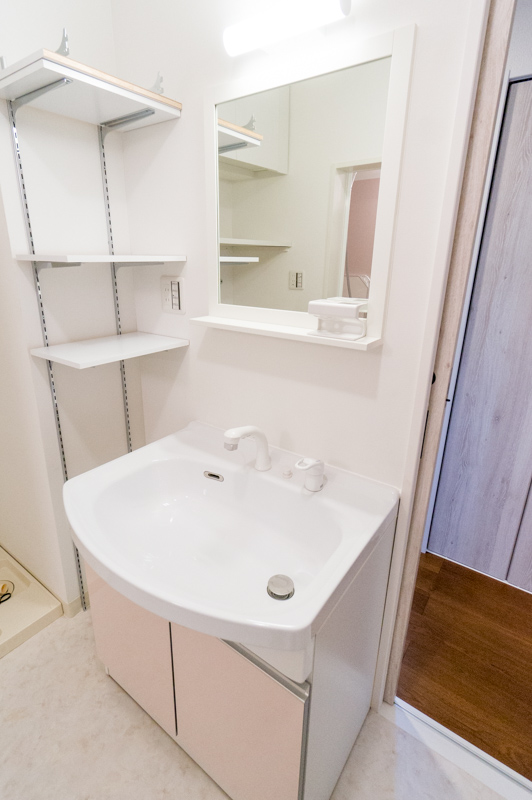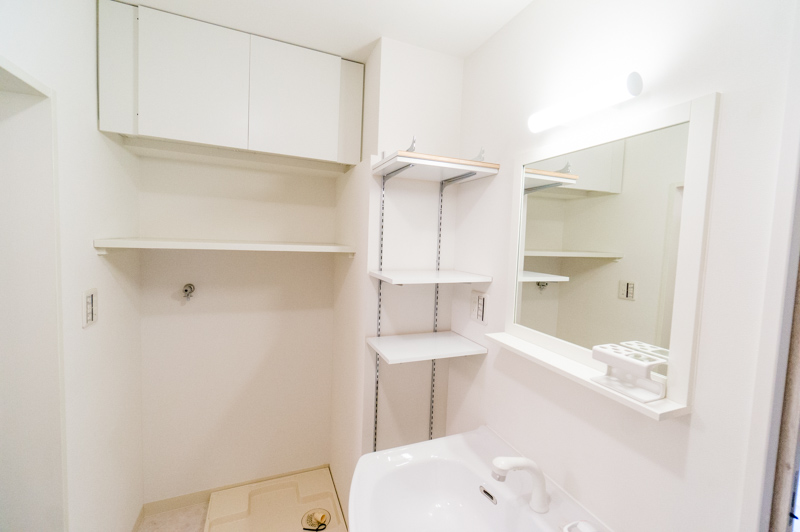 洗面所はインテリアを重視し、一体型ではなく鏡と照明を別でつけました。横に可動棚を取り付けているので見せる収納として使って頂ければと思います。