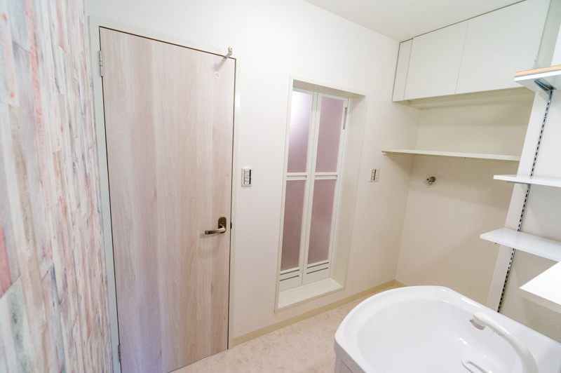 洗面側の壁もお手洗いと同じ壁紙を使ってワンポイントの演出!