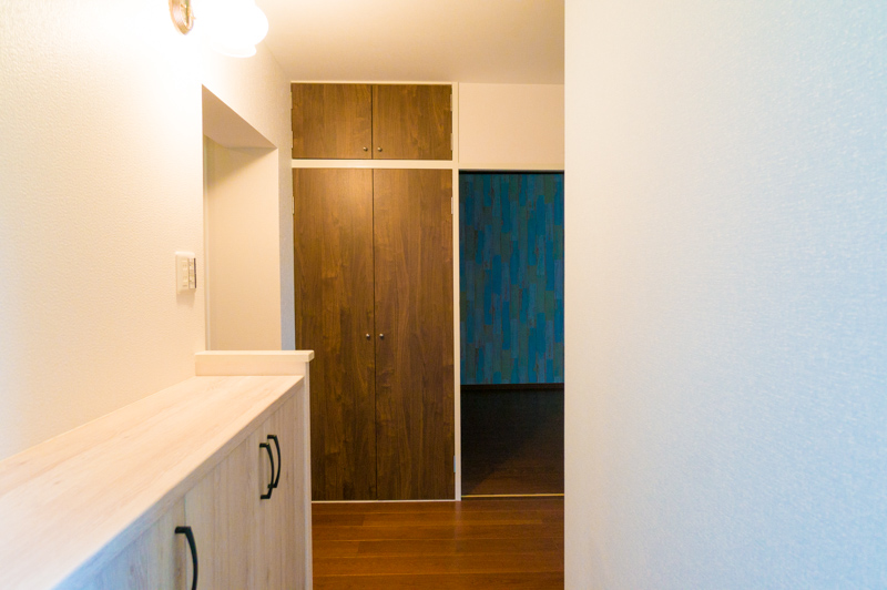 写真ではわかりづらいくて申し訳ないのですが、右側の壁紙は少し青みがかっているんです。ちょっとした変化が玄関の表情を豊かにしてくれています。