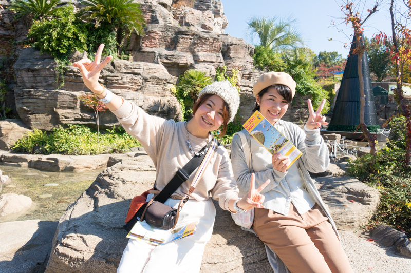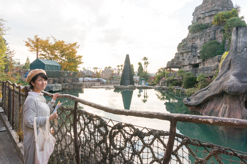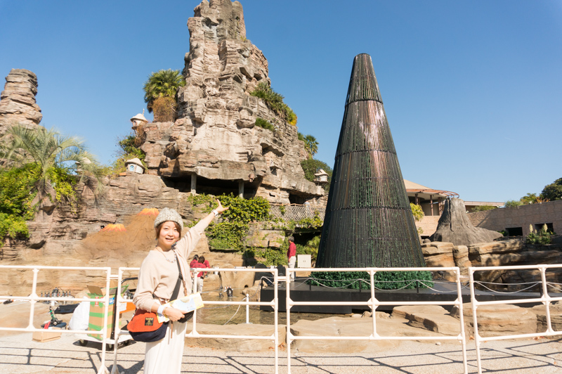 続いて、ひらパーらしい風景ということで「マジカルラグーン」(写真の後ろの岩の山)を入れて写真を撮りましょう!