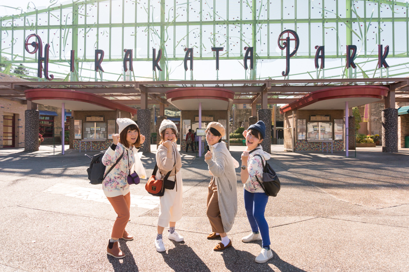 「来たで〜!」と言う感じを伝えるには、やっぱり「正面ゲート前」の「HIRAKATA PARK」の文字を入れての写真は外せませんね。