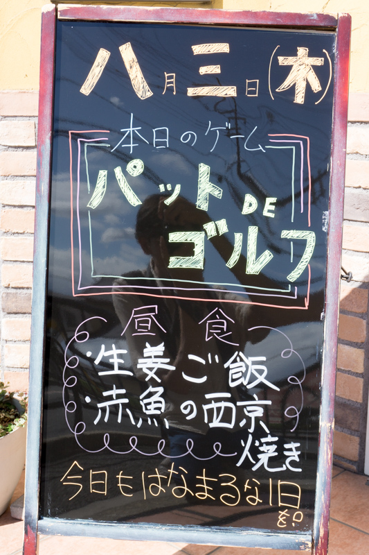 入り口にはその日のイベント内容とランチ献立が書かれたボートが立てかけてあります。
