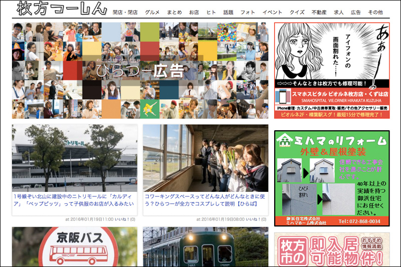 枚方つーしんは月間150万ページビュー(2015年12月)を誇る、枚方に特化した地域情報サイトです。