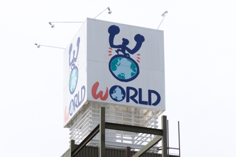 「WORLD」のロゴと、地球の上に立つ力持ちのイメージキャラクターが目印。