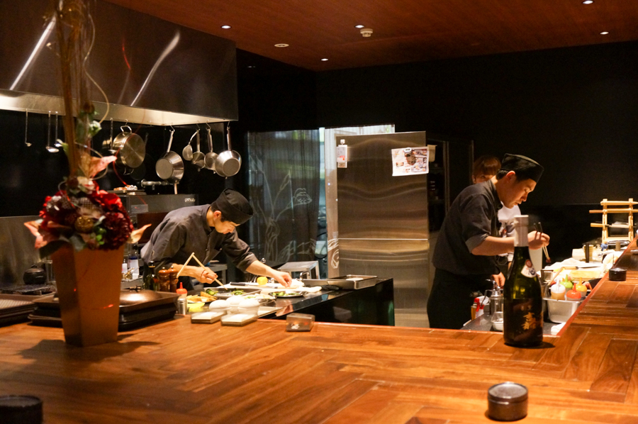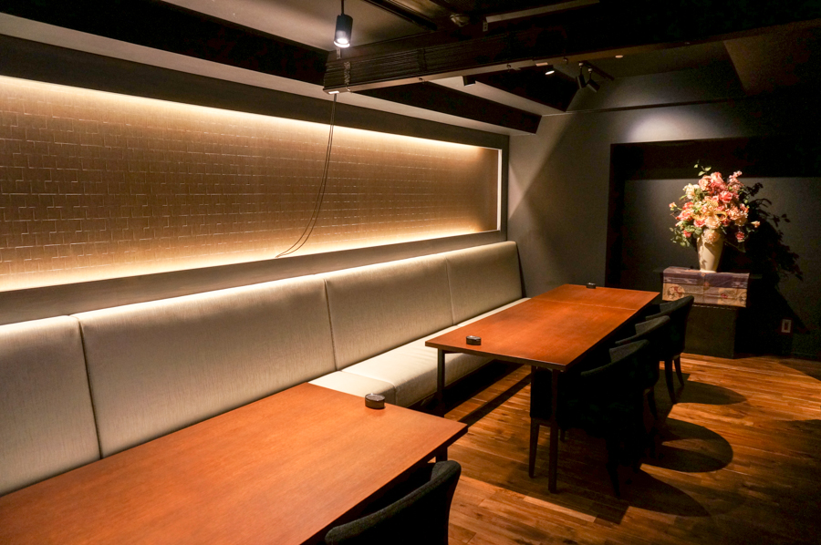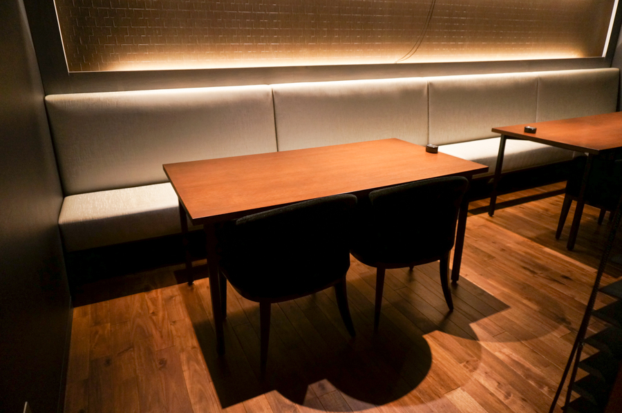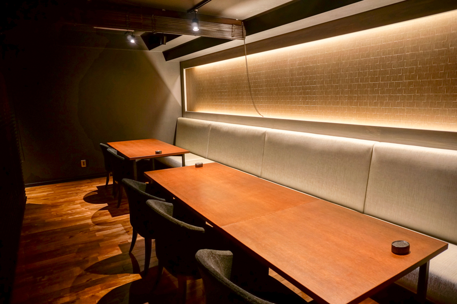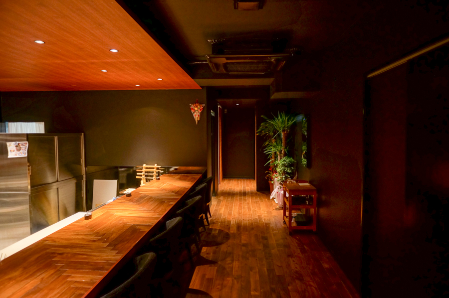 店内に入ると大きなカウンター席(11席)が見えます。お店のこだわりを伺ったところ「牧野や枚方にはあまりない珍しい空間づくりと、座っていただいたら分かっていただけると思いますが、ゆったりとくつろげる席が特徴です」とのこと。はじめてお店に入られると空間のギャップに驚かれること間違いなしのまさに「隠れ家」といった感じです