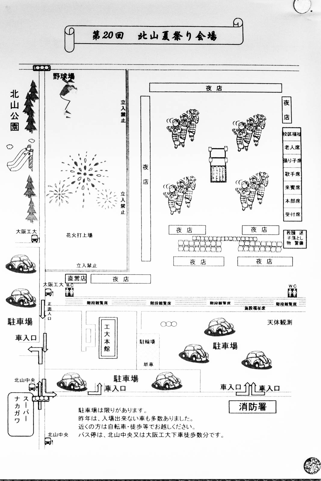 あくまで去年のものなので、もしかしたら今年は違うという可能性もありますが、公式の駐車場入口は三箇所あります。右下の消防署前から見ていきます。