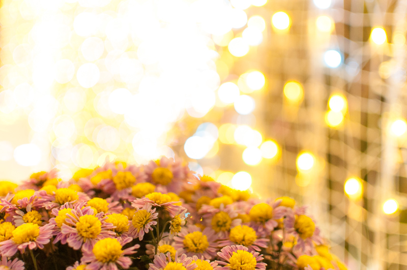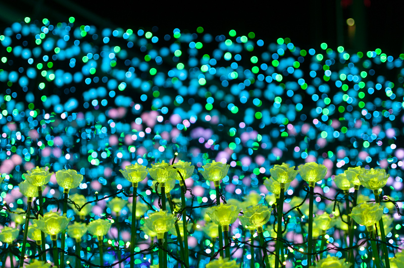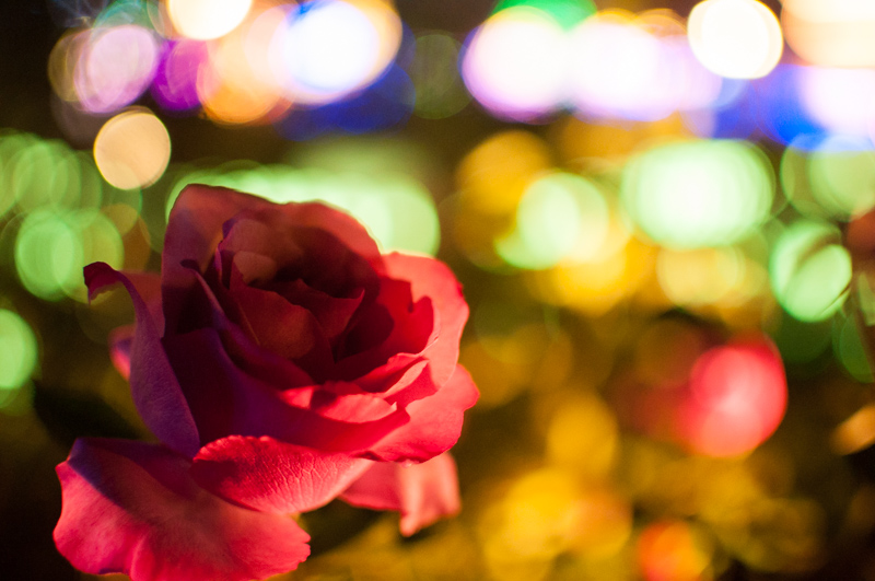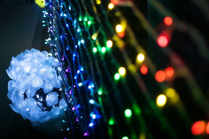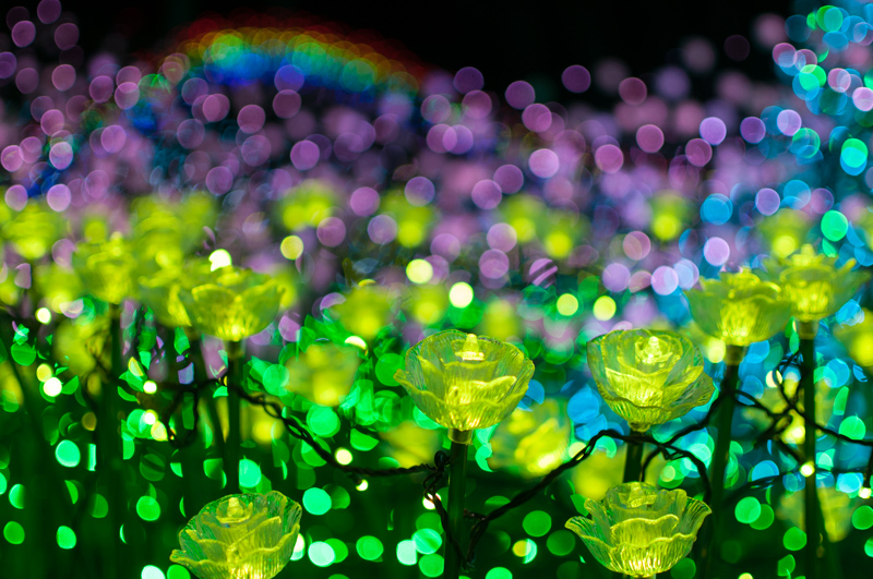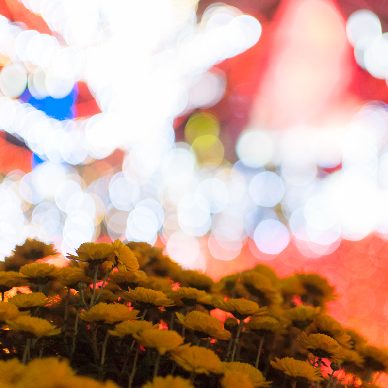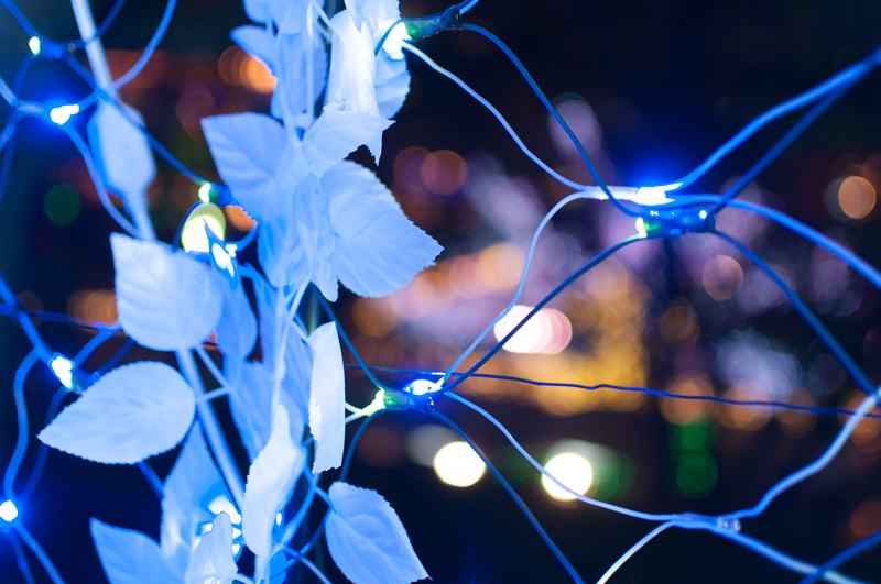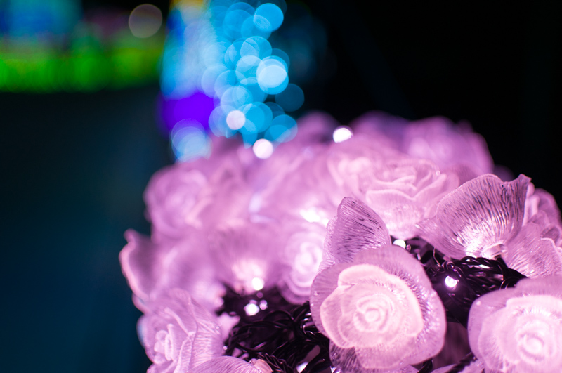 それを遠近を意識してうんと近いものにピントを合わせると、背景のイルミネーションが玉ボケになります。