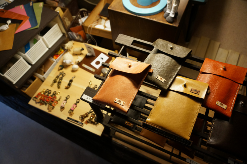 店内で作られた革小物を販売しています。