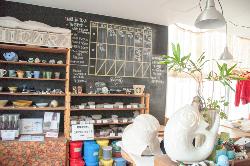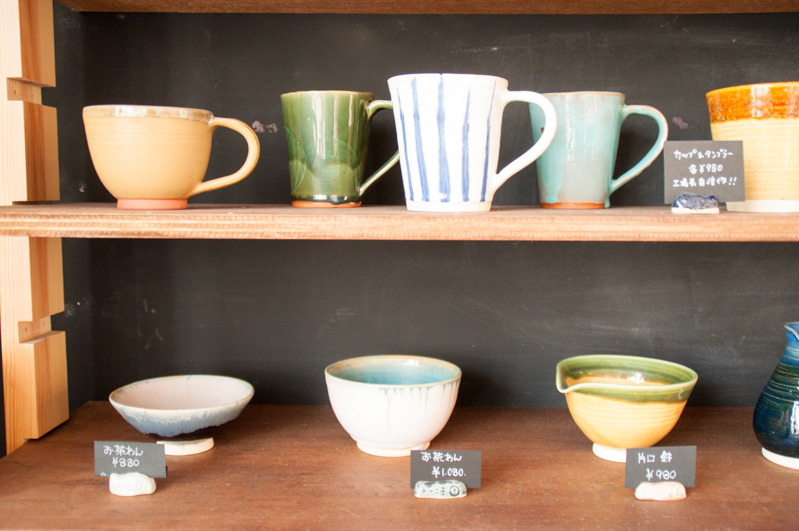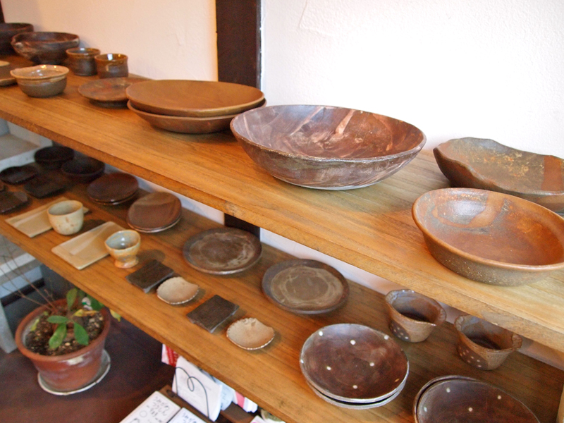 オーナーのサカモトジュンコさんが手ろくろで作った陶器の作品が並んでいます。
