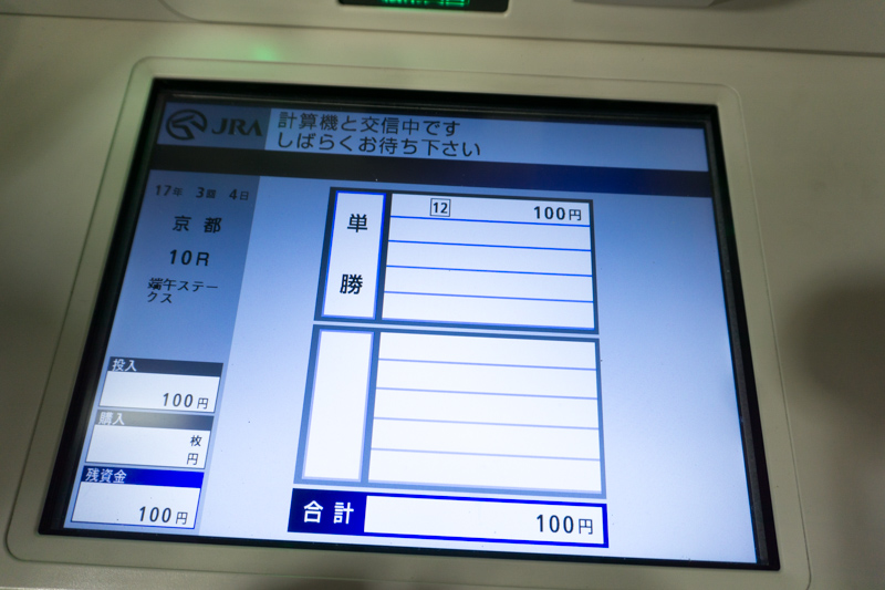 赤の印入れたところが必要事項。ざっくり言うと、京都会場・10レース目・単勝(1等馬)で、12番馬に100円賭けますよと。そうなんです、100円から賭けられるので、気楽に楽しめます。
