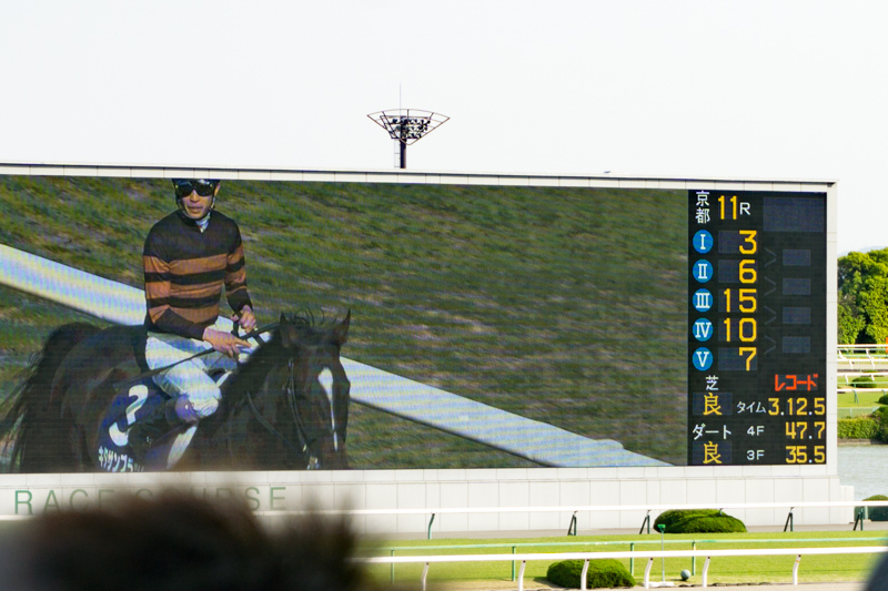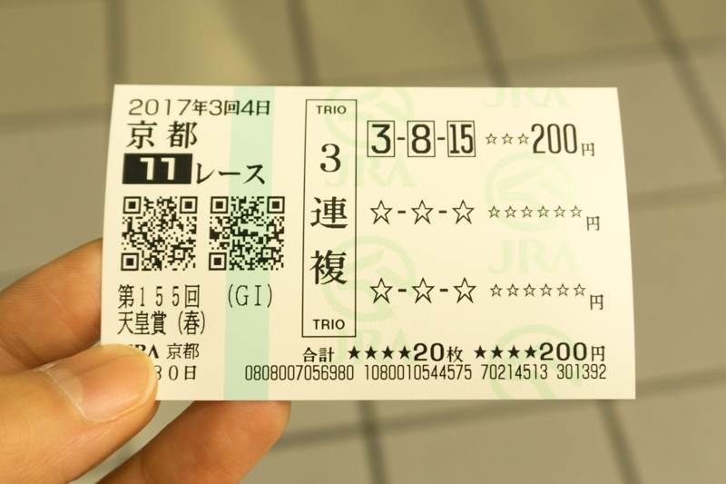 京都競馬場・11レース(G1)で、3連複(1〜3等の馬が順不同で到着したらOK)で3,8,15番のお馬に200円賭けますよと。(びびりですいませんw)あとは一緒に行った友人6人と一緒にまとめて買ったりもしました。