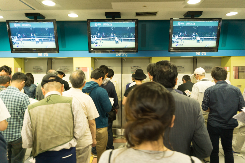 東京と新潟の競馬場でも時間差で同じようにレースが行われており同じく前のスクリーンでも流れるので、この競馬場で実際に走っていなくても馬券が買えて、一日中ずっと楽しめます。