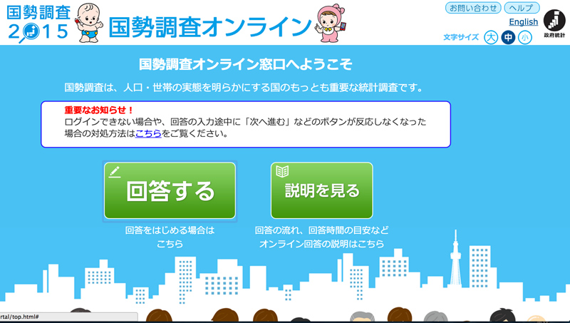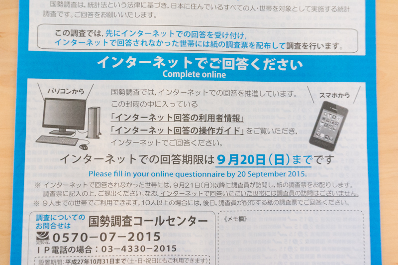 それまでに回答しないと、紙の調査票が配布されて結局どのみち回答しないといけないので、インターネットが使える人は今さくっと回答してしまった方が楽かなと思います