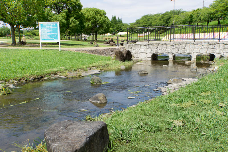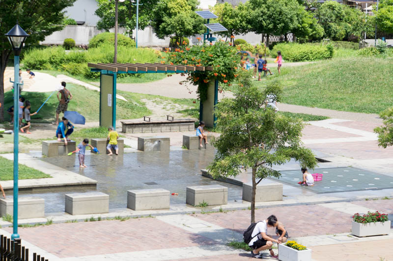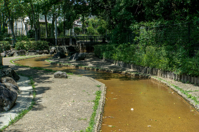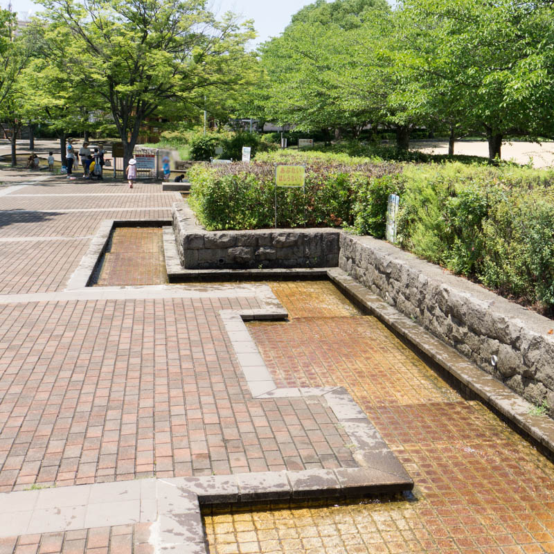 また、山田池公園内にはここ以外にも南地区芝生広場横にある、約170mの人工水路「流れ」でも水遊びが可能。