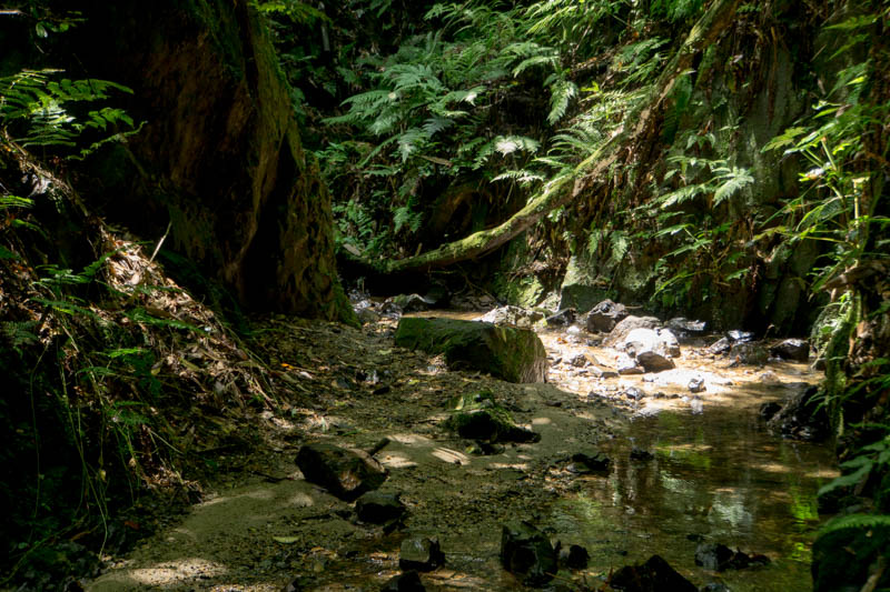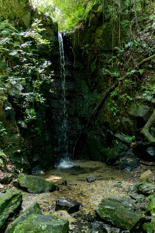 そこから上流の方へ少しアドベンチャーすると、先程の滝にたどり着きます。滝までは石の上をジャンプしたりしながら進んでいくと濡れずにいくこともできました。