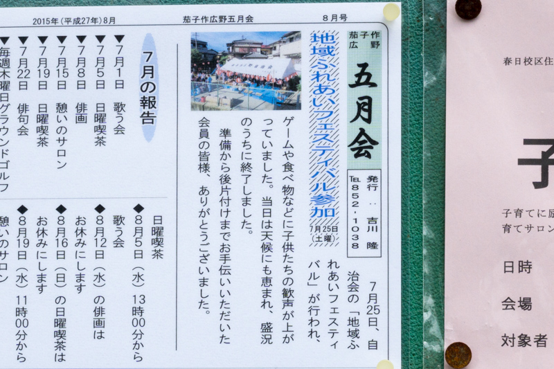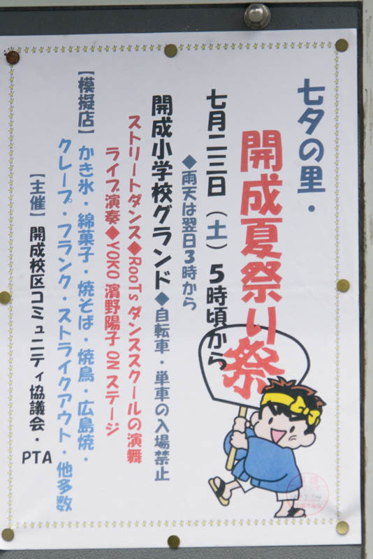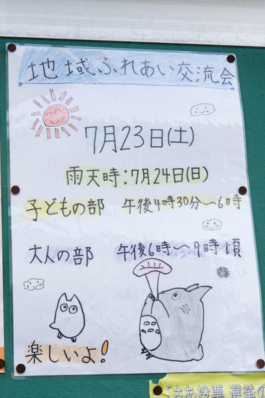 | 7/23(土) 16:30〜21:00 | 地域ふれあい交流会 | 不明、張り紙は茄子作4丁目で撮影。おそらく去年の地域ふれあいフェスティバルと同イベントと思われる →張り紙のあった場所 |