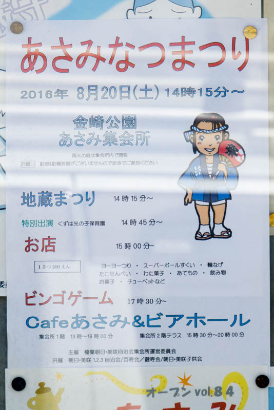 | 8/20(土) 14:15〜 | あさみなつまつり | 金崎公園 →地図 →張り紙 ビンゴ大会・カフェ・ビアガーデン有 |