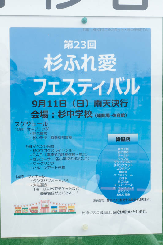 | 9/11(日) 10:00〜14:00 | 第23回 杉ふれ愛フェスティバル | 杉中 →地図 →張り紙 抽選会有 |