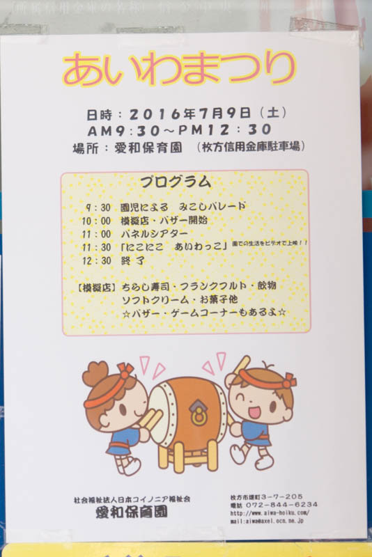 | 7/9(土) 9:30〜12:30 | あいわまつり | 枚方信用金庫駐車場 →地図 →張り紙 |