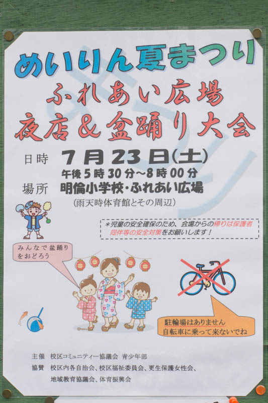 | 7/23(土) 17:30〜20:00 | めいりん夏まつり ふれあい広場 夜店&盆踊り大会 | 明倫小学校 →地図 →張り紙 盆踊り有 |